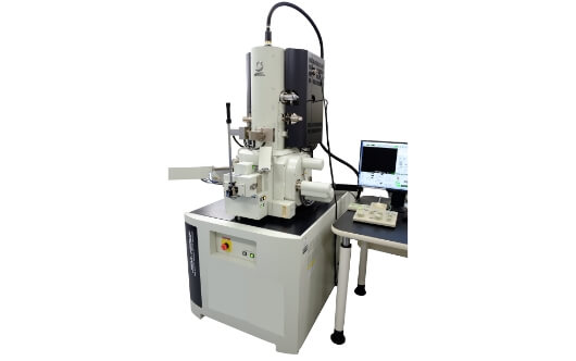 集束イオンビーム(Focused Ion Beam:FIB)装置は、集束したイオンビームを試料に照射し、加工や観察を行う装置です。また、FIB-SEMは高解像度のFE-SEM(電界放出形電子顕微鏡)を搭載しており、高分解能での観察と加工が同時に行えるのが特徴です。